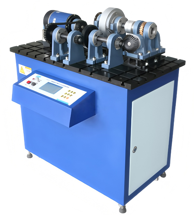 技术参数: 1、机械参数: 1.工作台机械部分由平板和各传动模块组成,平板采用45号钢平磨加工硫化表面,长900mm宽500mm厚25mm,平板上根据各传动模块的组成需要,铣制连接用T型槽;电机采用直流伺服电机,功率355W,电机通过轴承座连接,安装在平板上,中心高120mm;用磁粉制动器FZK-2.5作为加载器,采用轴承安装座安装在平板上,中心高120mm。 2、各配置模块零部件: 1.900X480mm平板(带机柜.:一套 2.电机组件:一套 3.制动器组件:一套(另配力臂. 4.轴承支座组件:两套 5.直齿圆柱齿轮传动组件:一套 6.斜齿轮传动组件:一套 7.园锥齿轮传动组件:一套 8.蜗杆传动组件:一套 9.V型带传动组件:一套 10.同步带传动组件:一套